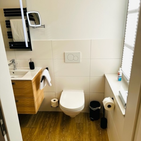 Das Bad erreicht man direkt aus dem Schlafzimmer und ist modern und komfortabel eingerichtet. Ideal Standard Möbel-Waschtisch, Dusche mit Glaskabine und Hansgrohe Thermostatarmatur mit Rainshower-Duschkopf, Toilette: Villeroy & Boch O.novo, Design-Handtuchheizkörper, Kosmetikspiegel sowie Fön.