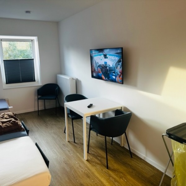 Für den komfortablen Schlafkomfort sorgt ein Boxspringbett (1,80 x 2,00 m) sowie ein weiteres Einzelbett. Ein 108 cm großer Smart-TV übernimmt das Entertainment. Ein Kleiderschrank, ein Ess-/Arbeitstisch mit drei Sesselstühlen sowie eine Garderobe sind ebenfalls vorhanden.