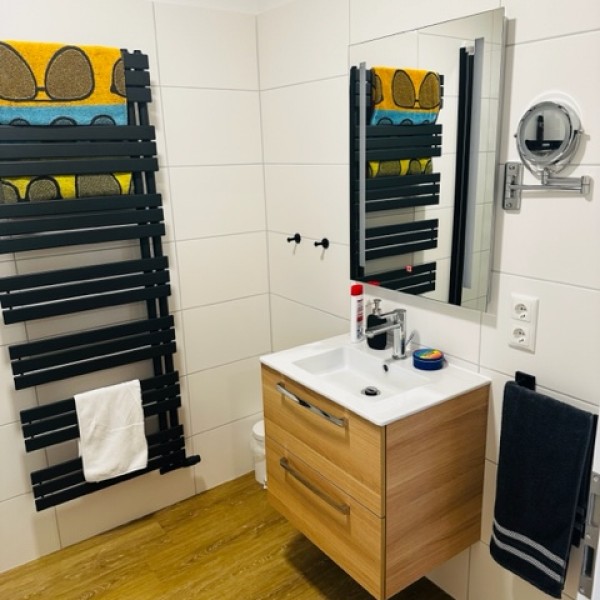 Das Bad ist modern und komfortabel eingerichtet. Ideal Standard Möbel-Waschtisch, Dusche mit Glaskabine und Hansgrohe Thermostatarmatur mit Rainshower-Duschkopf, Toilette: Villeroy & Boch O.novo, Design-Hand- tuchheizkörper, Kosmetikspiegel.